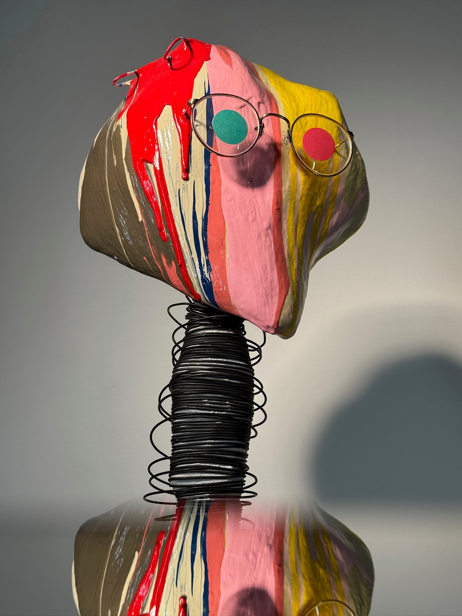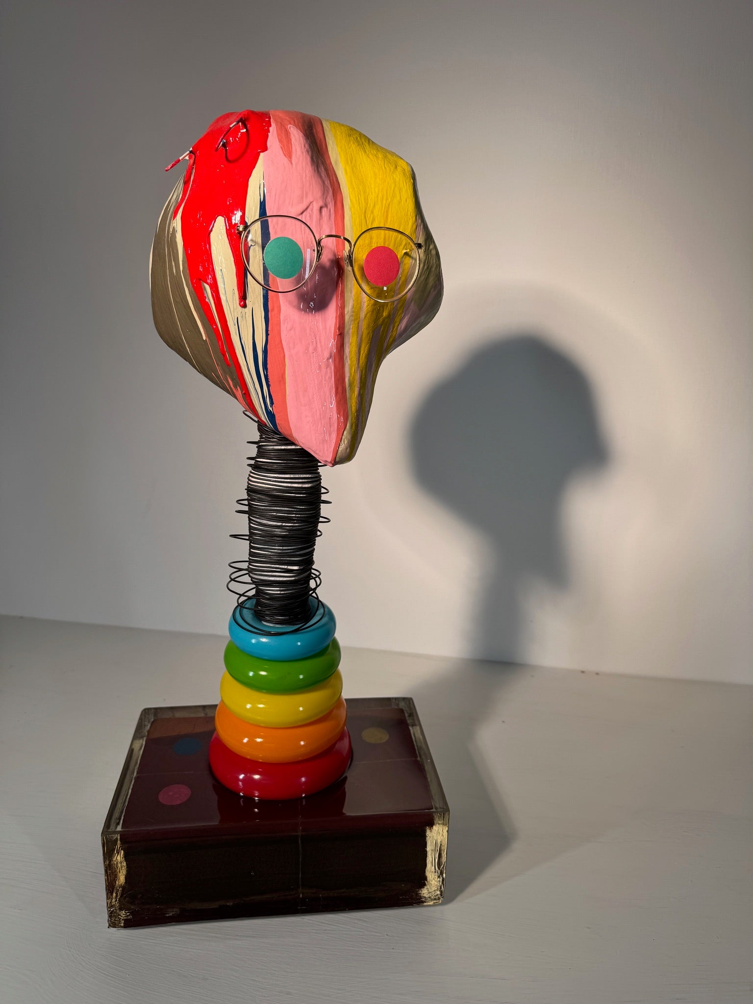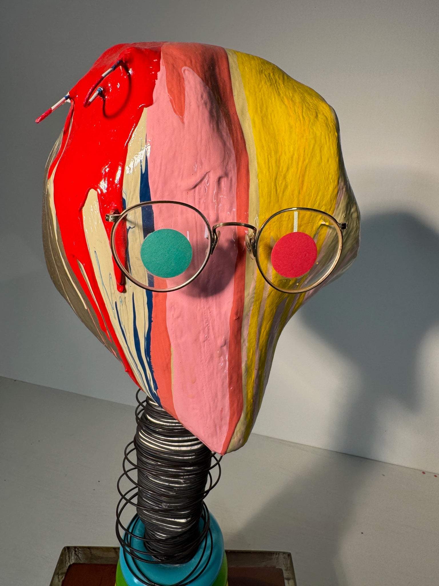 Plaster bandages on chicken wire structure reinforced with layers of epoxy resin and painted with acrylic paint.. Plastic coloured "doughnuts” and spiral wire to signify humour and thought transfer from the book to the Reader. Real wire rimmed glasses. Base is transparent epoxy resin encasing a mystery book. Has rubber feet for stability