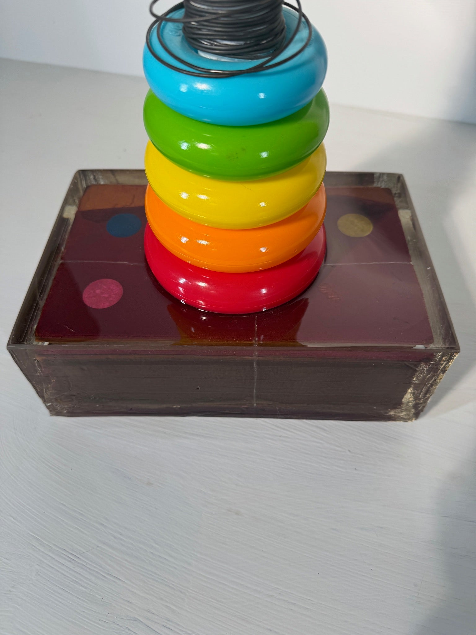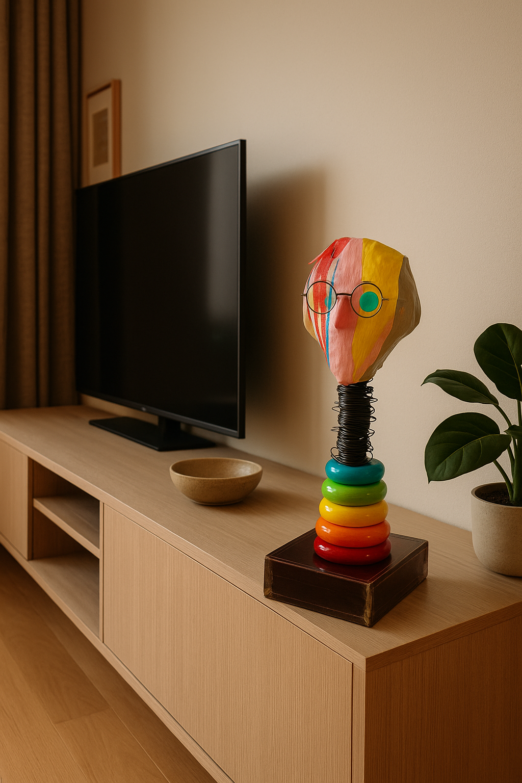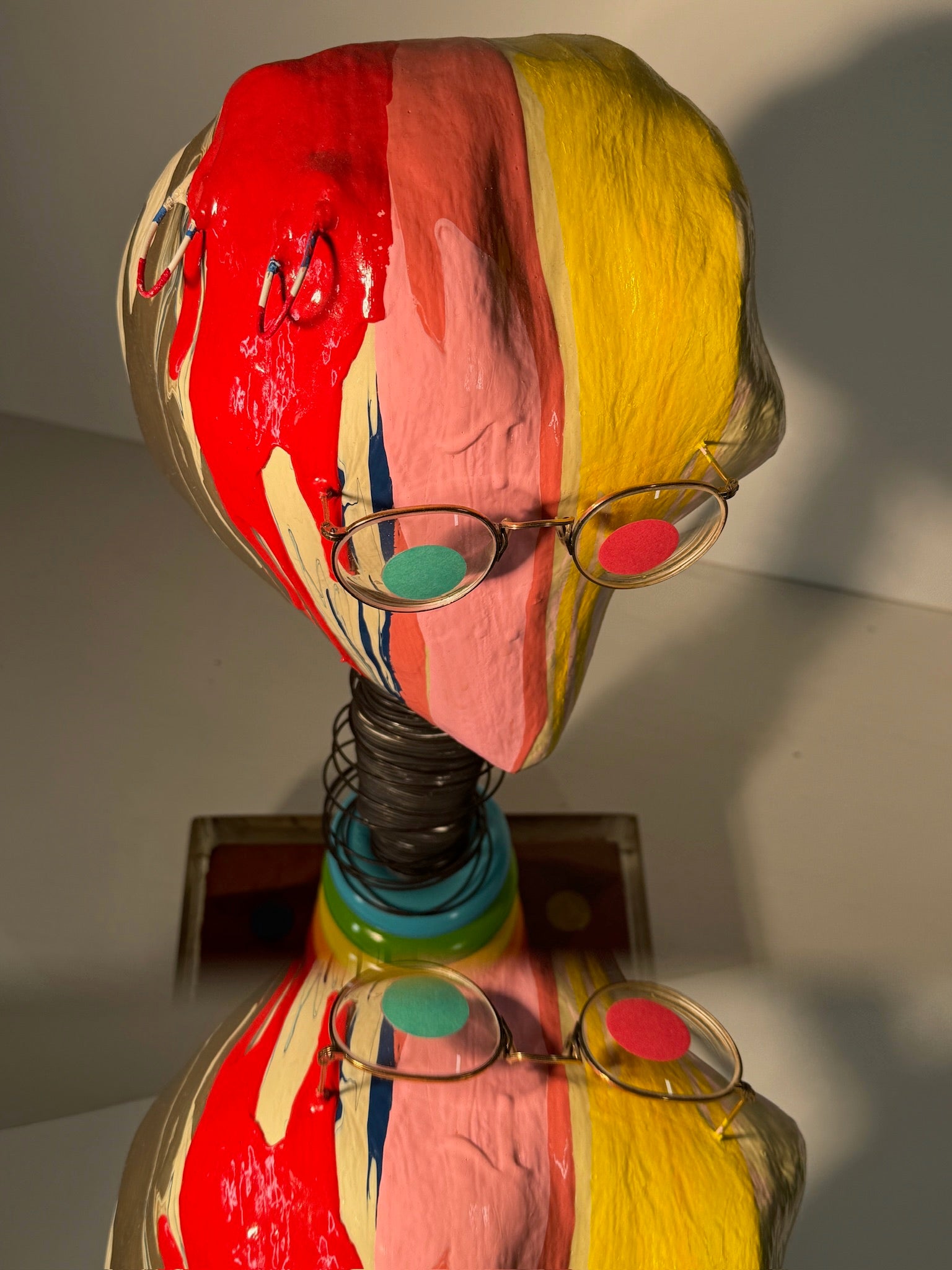 Plaster bandages on chicken wire structure reinforced with layers of epoxy resin and painted with acrylic paint.. Plastic coloured "doughnuts” and spiral wire to signify humour and thought transfer from the book to the Reader. Real wire rimmed glasses. Base is transparent epoxy resin encasing a mystery book. Has rubber feet for stability